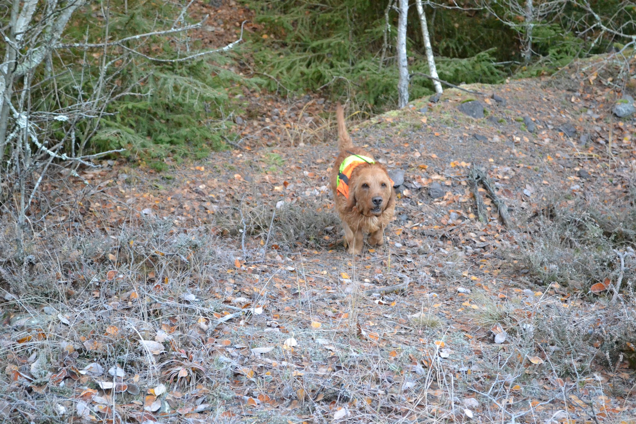 Baloo och husse tävlar om vem som är snabbast i skogen, december 2013.