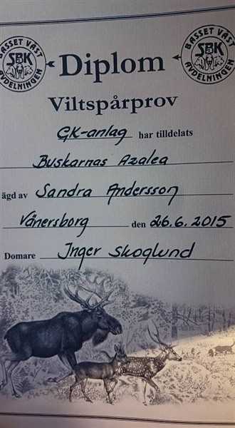 Fredagen den 26 juni var Dolly (Buskarnas Azalea) och fodervärden Sandra hos Inger Skoglund för att gå anlagsklassen i viltspår. Det gick alldeles utmärkt och Dolly blev godkänd.